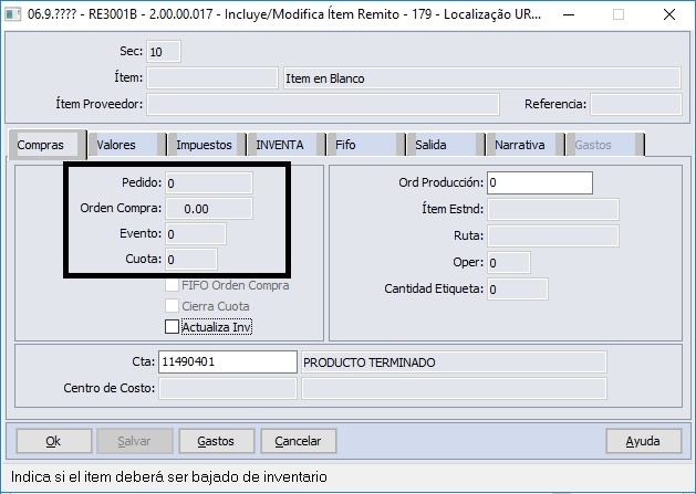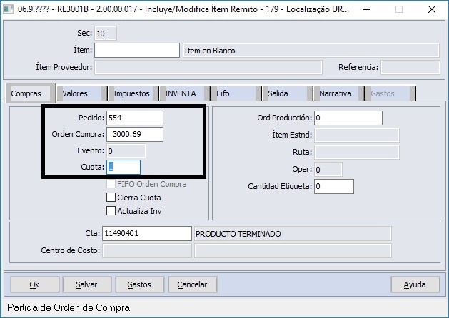 Ao salvar o item, os valores nos campos de Pedido e Ordem de Compra serão apagados.. Será possível ver o valor alocado no programa Consulta Saldos Contrato/Itens (CN0603).