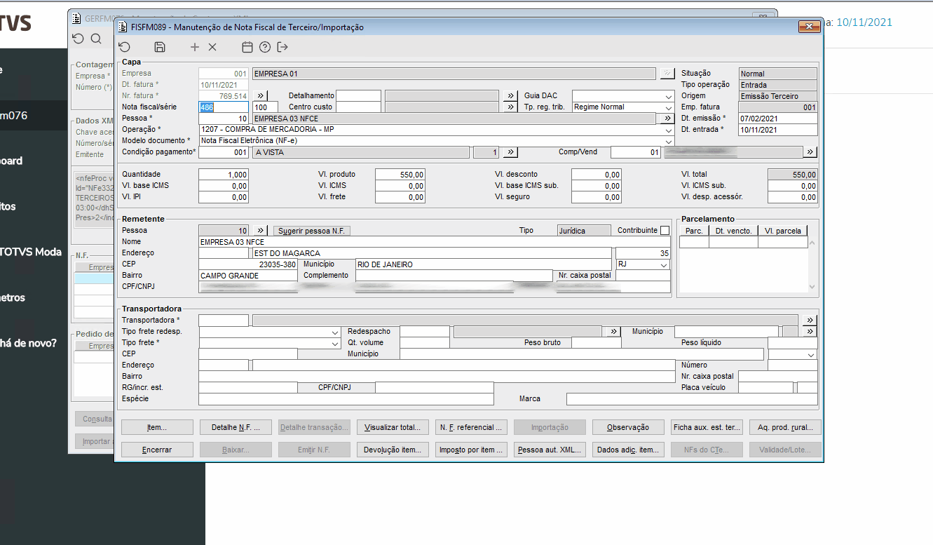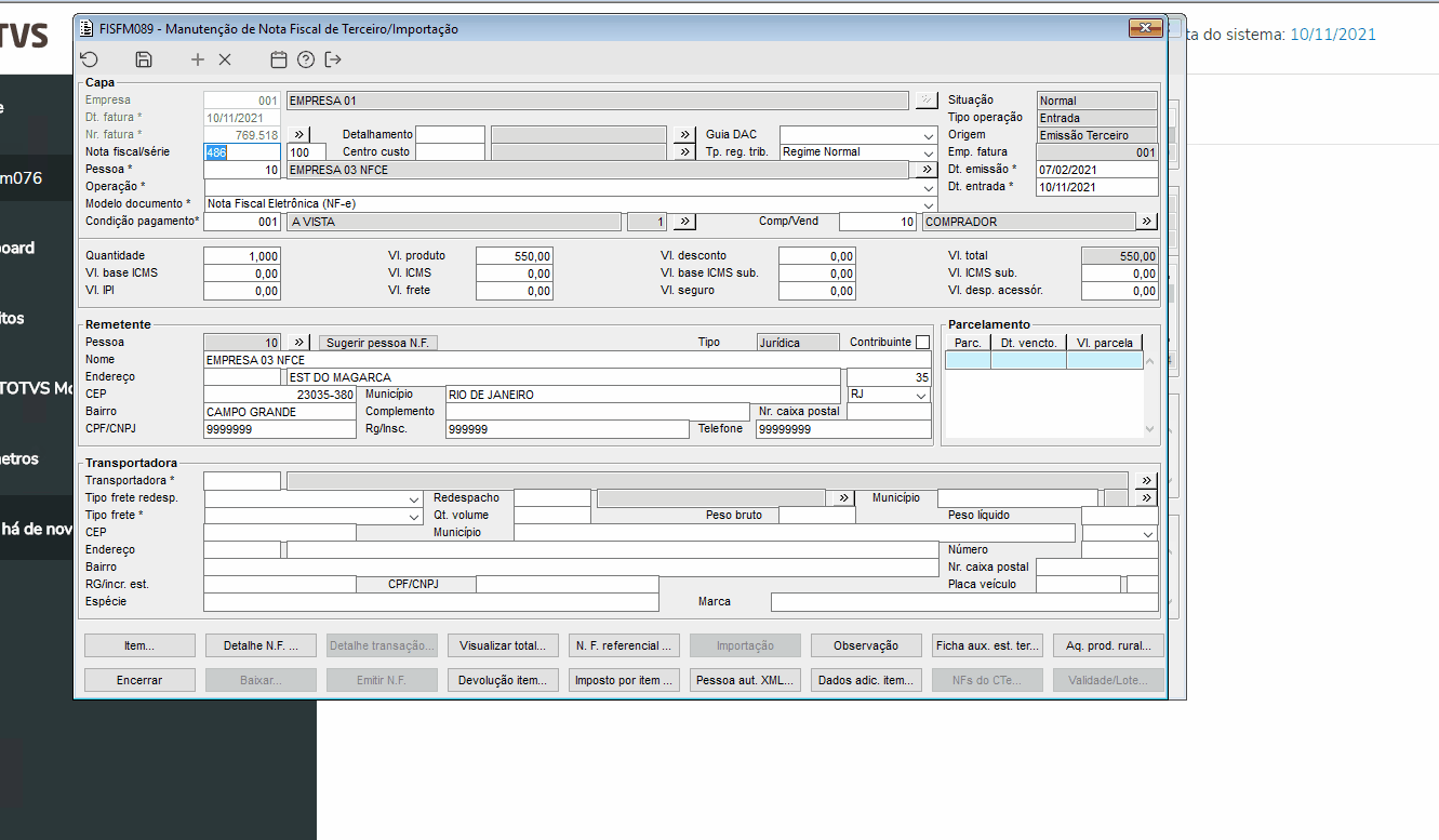 | Função: | FISFM089 - Manutenção de nota fiscal de terceiro/Importação |