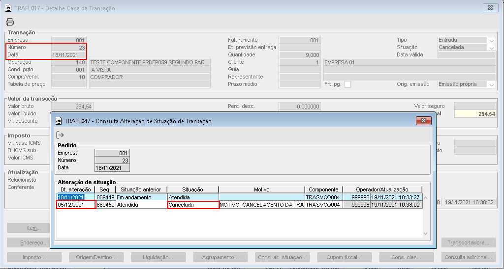 Imagem 04 - Demonstração da transação de entrada finalizada no mês 11 e cancelada no mês 12.