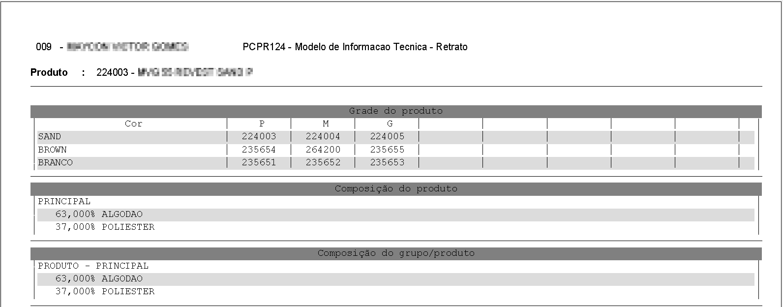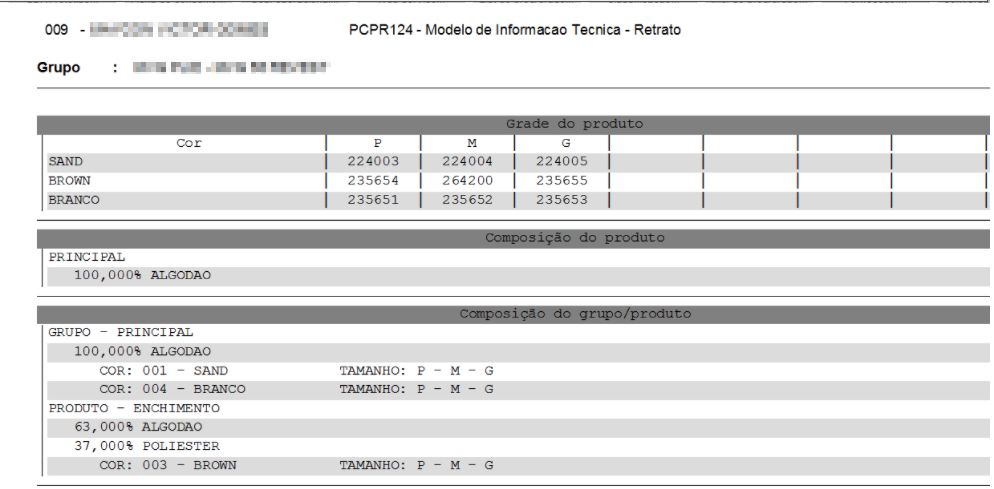 Impressão do modelo de informação técnica de produto por grupo, ser possível visualizar as diferentes composições, agrupadas por cor e tamanho.