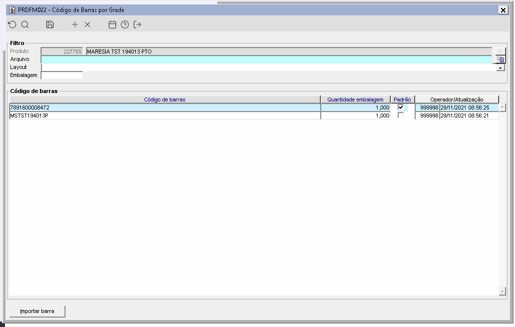 Função:PRDFM022 - Código de Barras por Grade