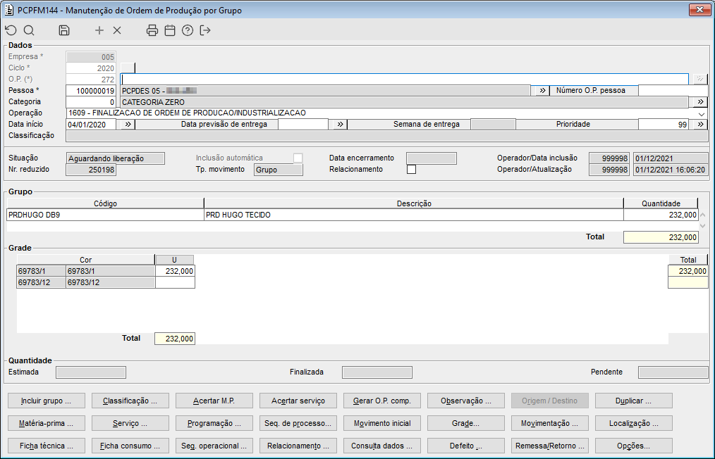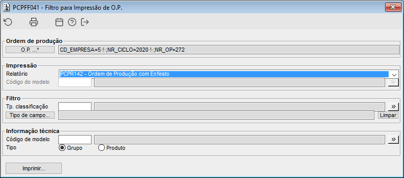 Imagem 6 - Demonstra o filtro para impressão da O.P. com a O.P. demonstrada na imagem 5 filtrada e o relatório PCPR142 selecionado para impressão.