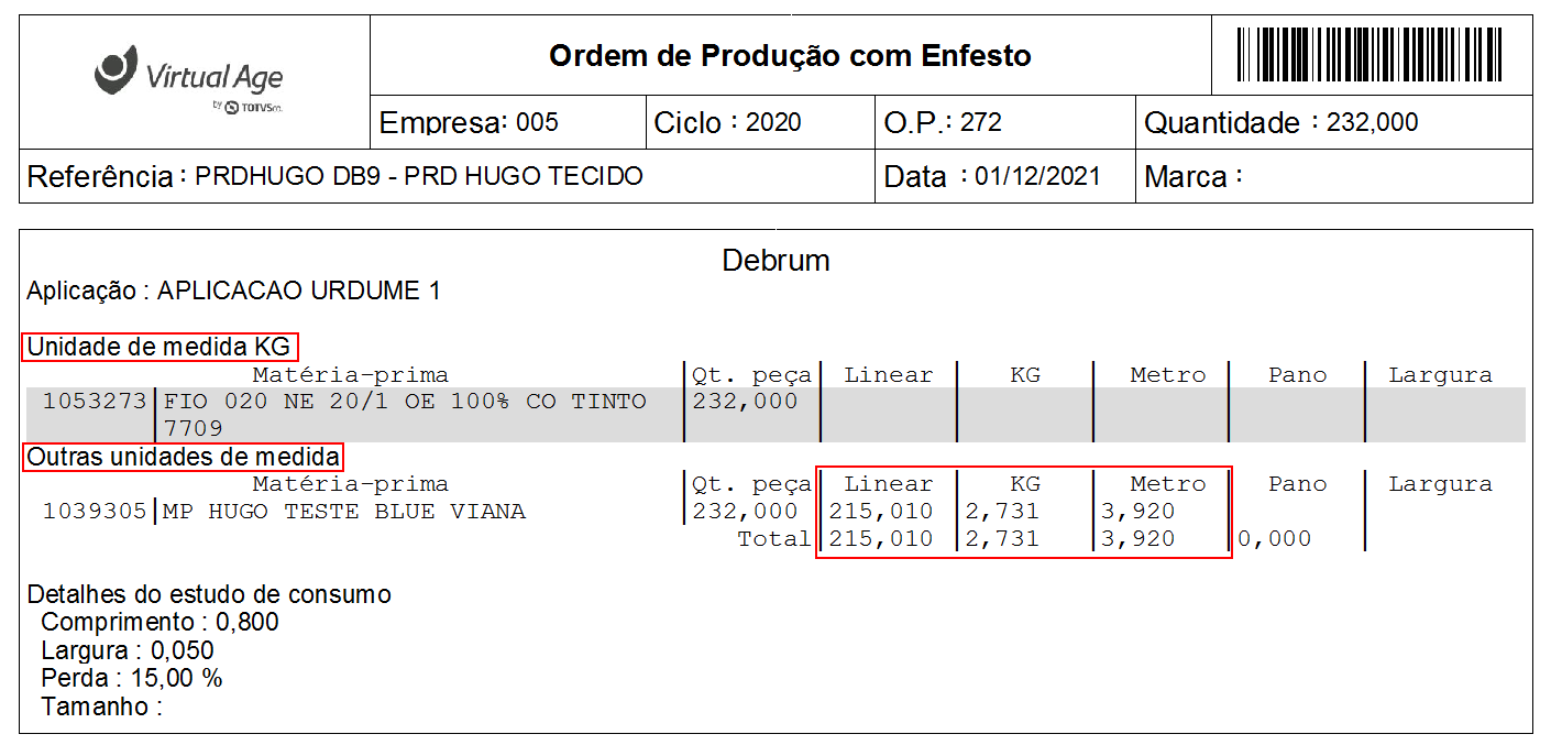 Imagem 7 - Demonstra a impressão do relatório PCPR142 separando a impressão das matérias-primas pela espécie corresponde ao parâmetro citado mais acima das que não correspondem, e o resultado das colunas "Linear", "KG" e "Metro" conforme o cálculo descrito no item 03. Solução.