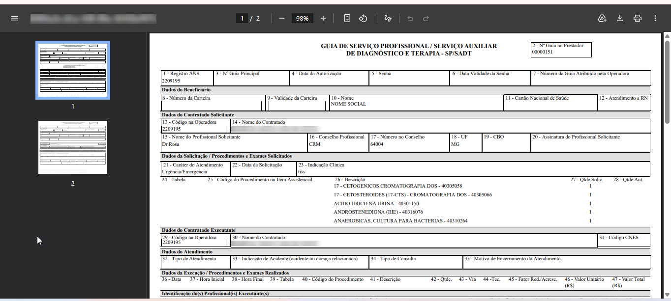 Permite ao usuário realizar a impressão da guia de solicitação de SP/SADT com os exames solicitados pelo meu de solicitação de exames do PEP RM.