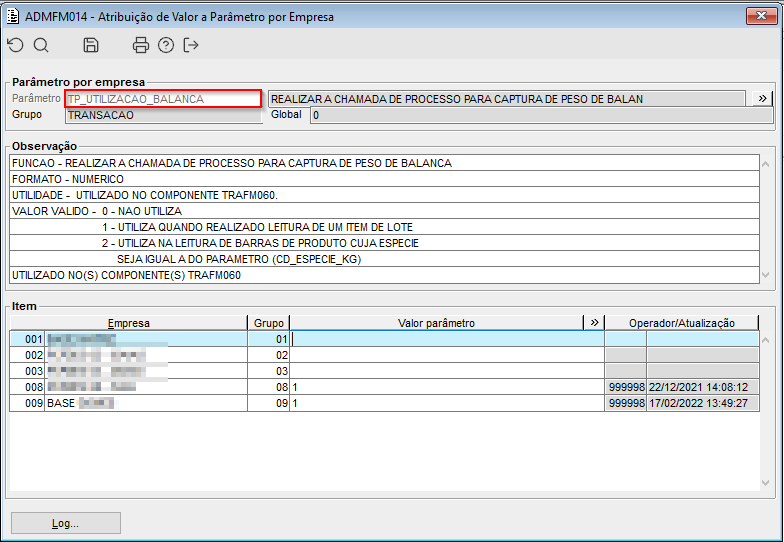 Imagem 01 - Demonstra o componente ADMFM014, onde está sendo configurado o parâmetro empresa "TP_UTILIZACAO_BALANCA" com o valor 2 para a empresa "001".