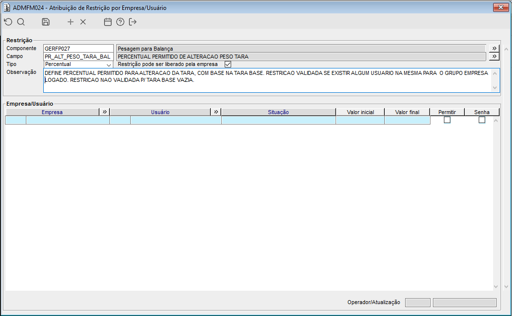 1- Quando não for informado usuário na restrição, no campo "Tara (Kg)" do componente GERFP027, não será permitido informar um valor maior do que o informado no campo "Tara lote (Kg)".