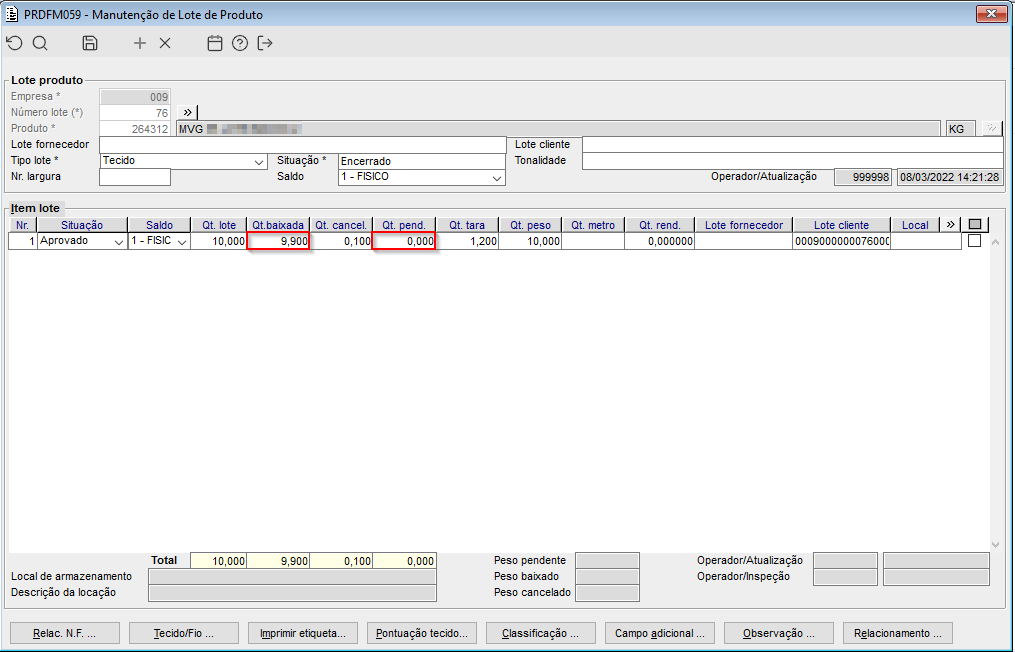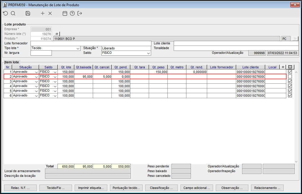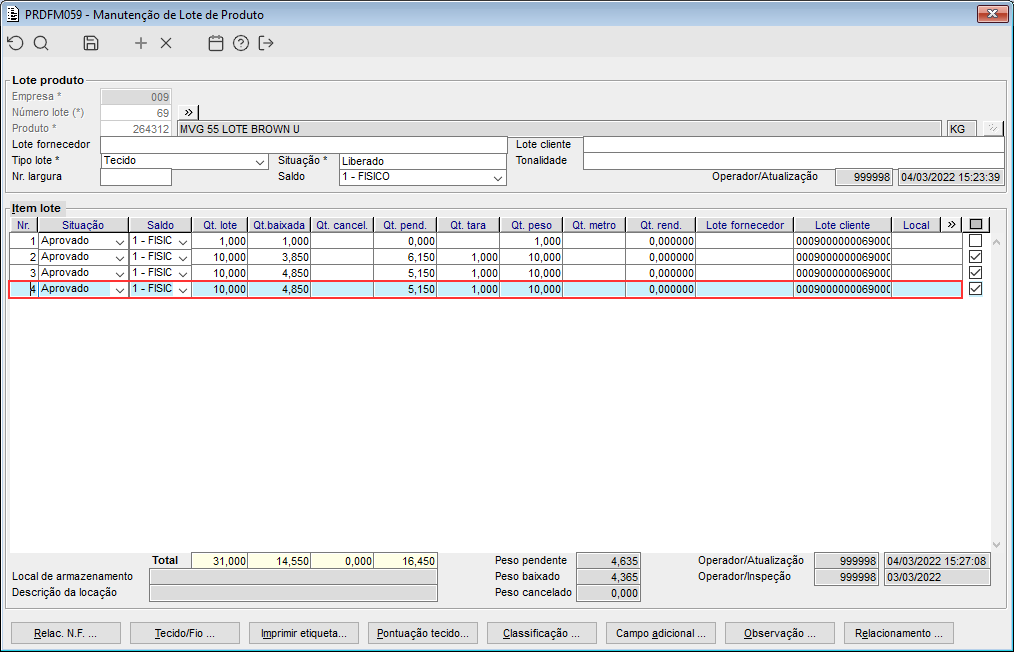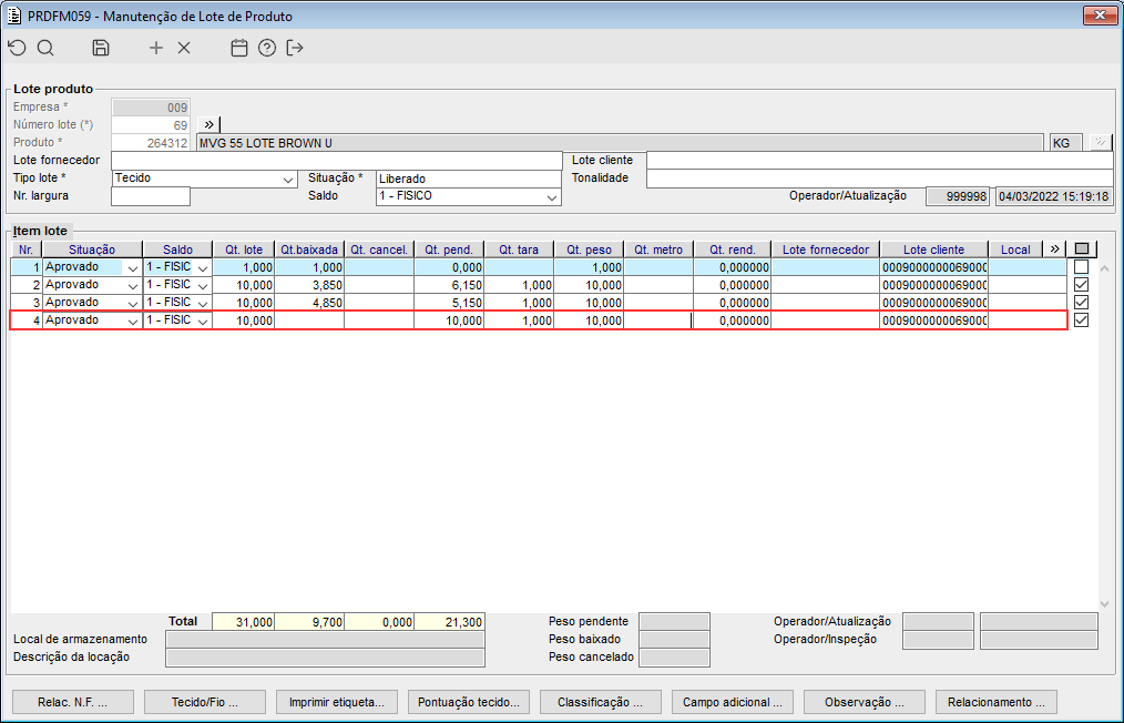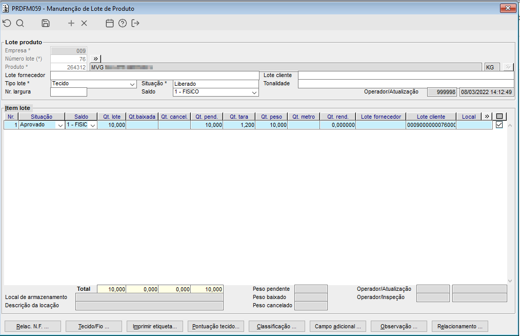 Imagem 04 - Demonstra o componente PRDFM059, onde ao realizar a consulta do item de lote pode ser visto que a quantidade de lote e peso passou a ser 150.
