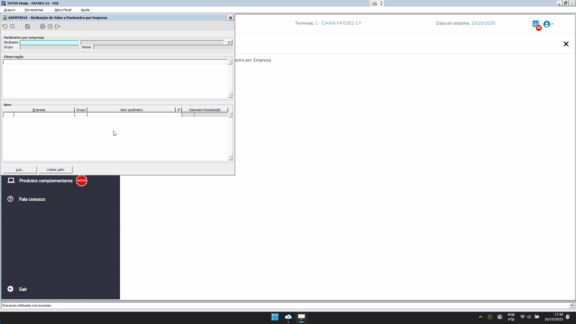 Imagem 01 - Demonstra o componente ADMFM014, onde está sendo configurado o parâmetro empresa "TP_UTILIZACAO_BALANCA" com o valor 1 para a empresa "09".