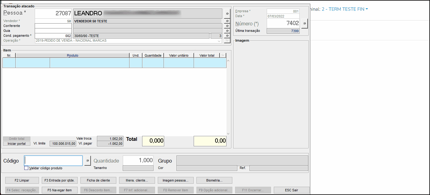 - TP_UTILIZACAO_BALANCA: Que quando configurado com o valor "1" ao informar um produto de item de lote na venda realizada através do componente TRAFM060 , será apresentado o componente GERFP027 onde será possível realizar a leitura do peso da balança para o produto informado na transação, caso configurado como "1" será aplicado para itens de lote, caso configurado como "2" a alteração se aplica para produtos que possuírem a mesma espécie cadastrada no parâmetro empresa "CD_ESPECIE_KG" independente de ser de lote ou não.