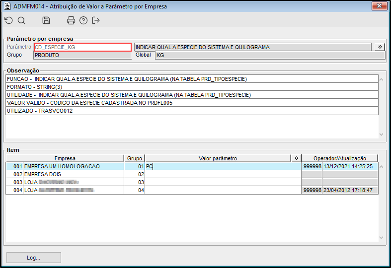Imagem 02 - Demonstra o componente ADMFM014, onde está sendo configurado o parâmetro empresa "CD_ESPECIE_KG" com o tipo de espécie "PC".