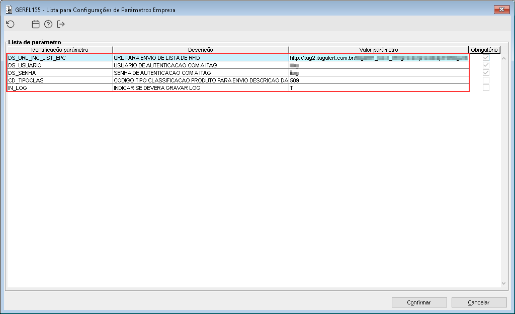 Foi desenvolvido o parâmetro empresa "DS_CONFIG_INT_ITAG" que tem como objetivo receber a configuração referente a integração do RFID com a plataforma ITAG. Também foi criada a restrição "IN_PERMITIR_INT_ITAG" para o componente PCPFP188 e quando configurada permite que o usuário configurado possa realizar a integração do RFID com a plataforma da ITAG.