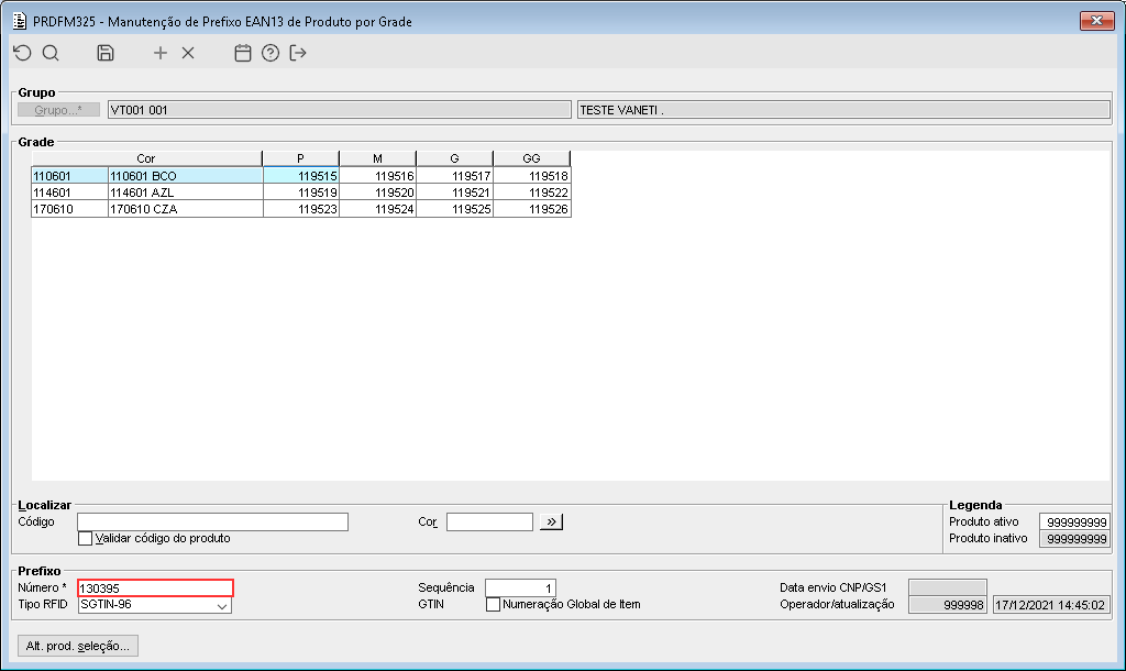 Imagem 04 - Demonstra o componente PRDFM325 onde está sendo consultado o grupo de produto "VT001 001" e pode ser visto o prefixo referente ao produto e o tipo de RFID configurado.