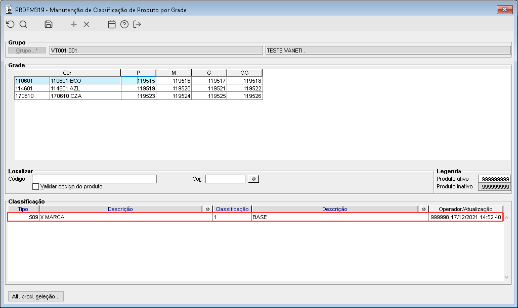 Imagem 05 - Demonstra o componente PRDFM319 onde pode ser visto que a classificação "509" está configurada para todo o grupo de produto "VT001 001".