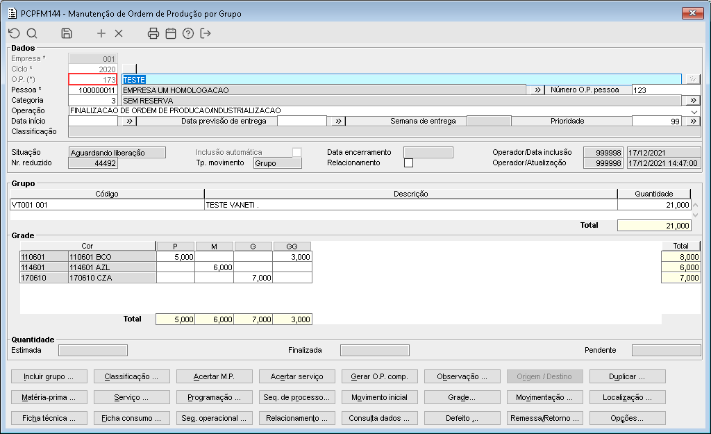 Imagem 06 - Demonstra o componente PCPFM144 onde pode ser visto que foi criada a O.P. 173 e que a mesma possui o grupo de produto "VT001 001" com algumas quantidades para a sua grade.
