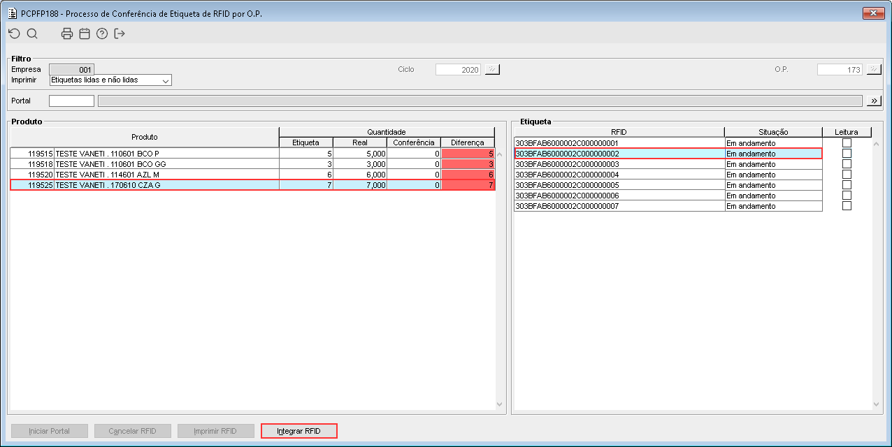 Imagem 07 - Demonstra o componente PCPFP188 onde foi informada a O.P. 173, geradas as etiquetas RFID através do portal e em seguida acionado o novo botão "Integrar RFID".