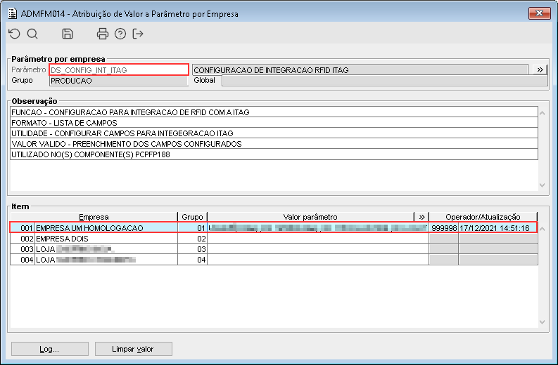 Imagem 01 - Demonstra o componente ADMFM014 onde está sendo configurado o parâmetro empresa "DS_CONFIG_INT_ITAG" para a empresa 001.