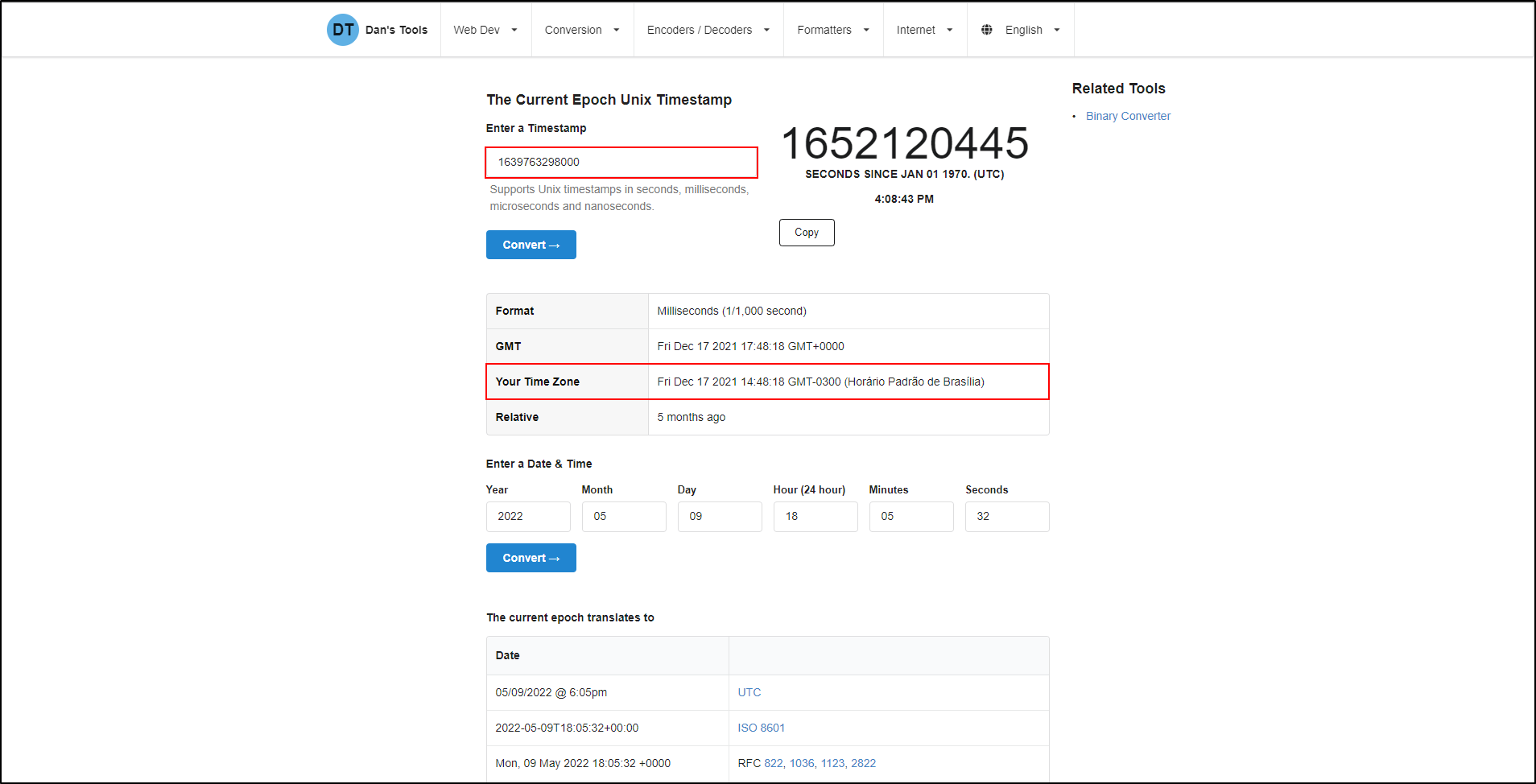 Imagem 11 - Ao consultar a data que foi retornada e realizar a conversão do TIMESTAMP retornado, pode ser visto que a data apresentada é: 17/12/2021 no horário: 14:48:18 (Horário de Brasília).