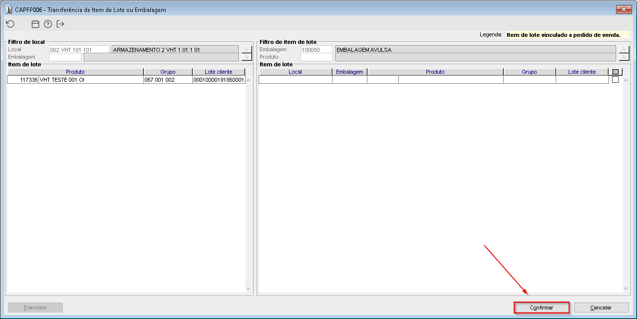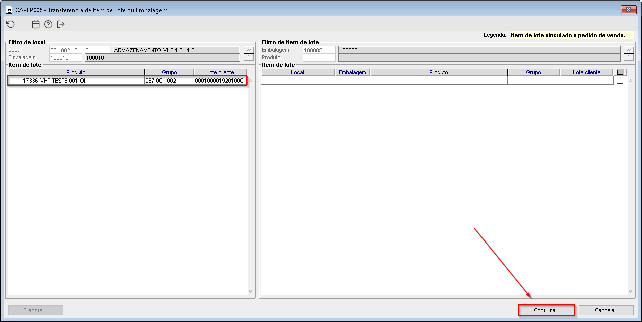 Imagem 5 - No componente CAPFP006 foi selecionado o local "002 VHT 101 101" sem embalagem vinculada como destino. Depois foi selecionada a embalagem "100050" como origem e acionado o botão "Transferir".