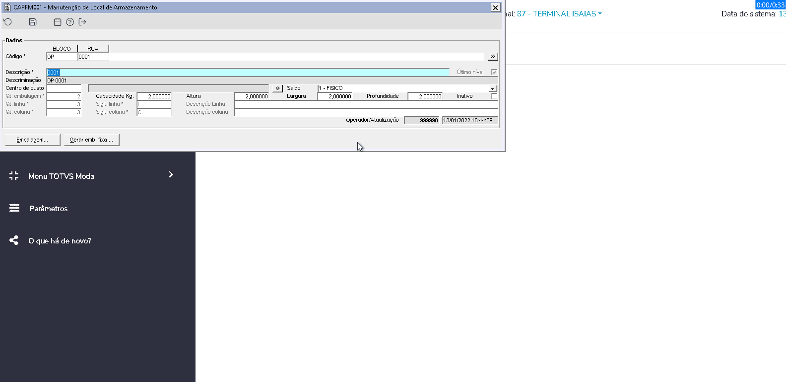 Imagem 3 - O local de armazenamento DP 0003 não possui saldo configurado, e o saldo da operação do pedido de venda é o 1-FISICO. Ao acionar o componente CAPFM009 foram exibidas as embalagens 989 e 990 com os produtos do pedido que estão vinculadas ao local de armazenamento.