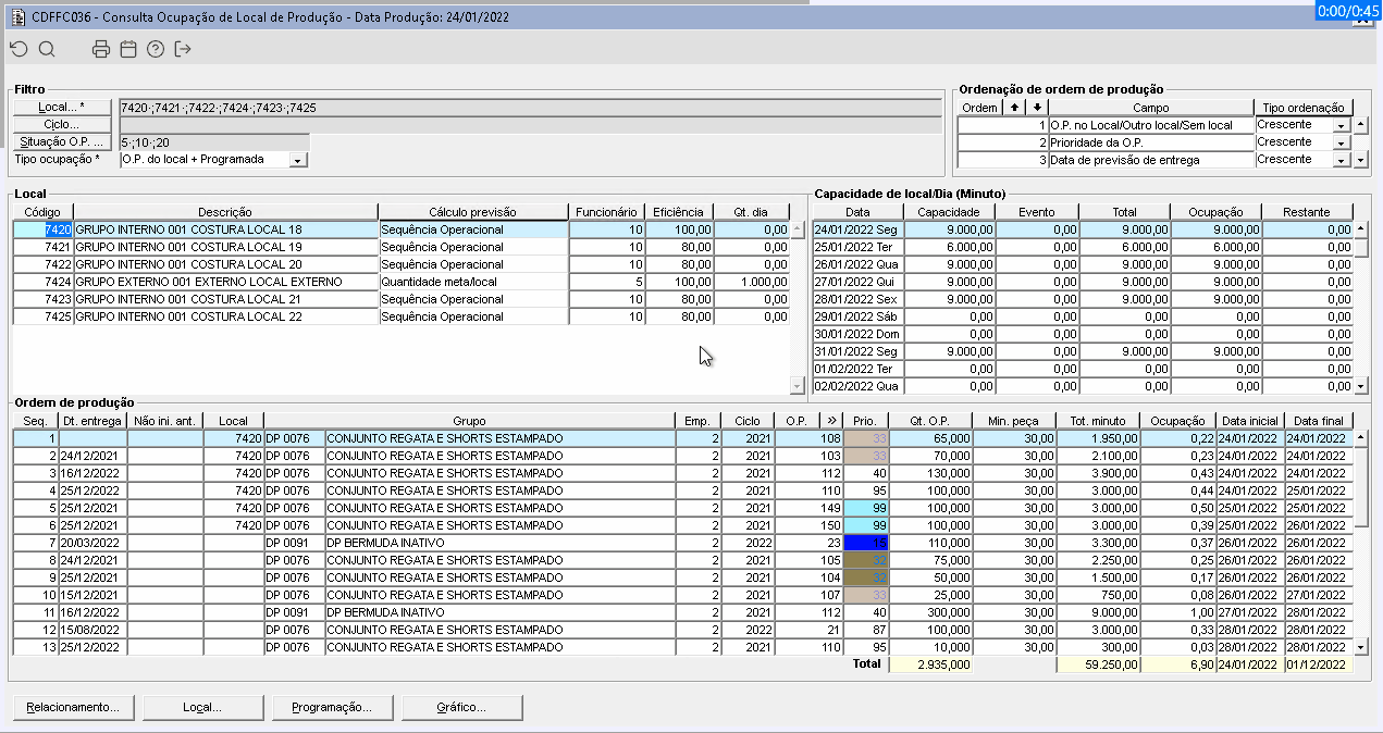 Imagem 1 - No exemplo acima foi realizada a ordenação das O.Ps. conforme as opções disponíveis no frame Ordenação de ordem de produção, neste caso as O.Ps. foram ordenadas pela data de previsão de entrega(decrescente), pela O.P. no Local/Outro local/Sem local(crescente), pela prioridade(decrescente), pela data de inclusão das O.Ps.(crescente) e pela data de início das O.Ps.(crescente).