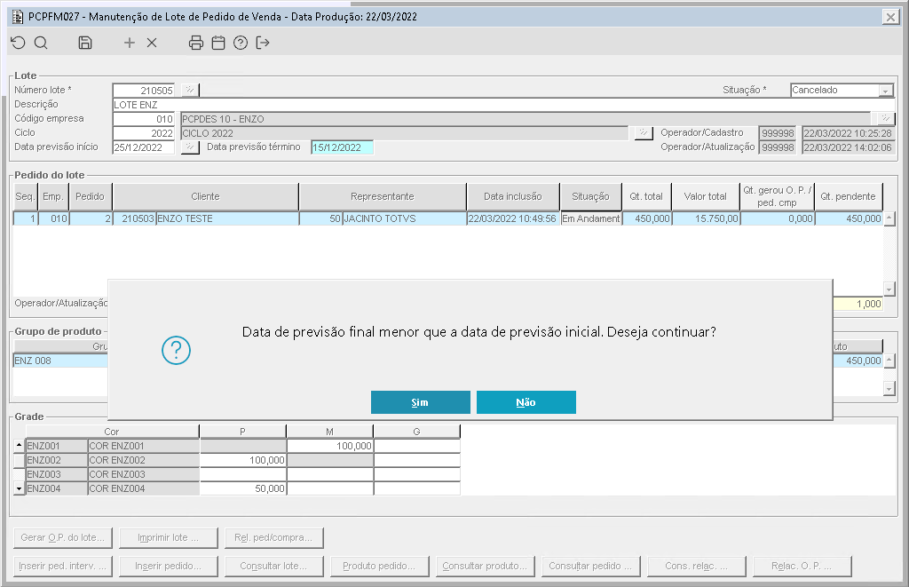 - Ao possuir um lote de planejamento de venda com a situação concluído, bloqueado ou cancelado e navegar pelos botões "Inserir produto..." ou "Inserir ped. interv. ...", uma mensagem avisando sobre a situação do lote será apresentada.