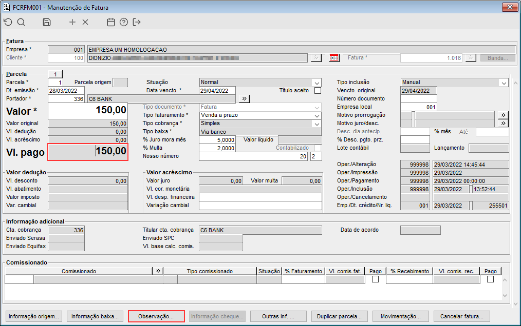 Imagem 07 - Ao consultar a fatura novamente, pode ser visto que o valor pago passou a ser "R$ 150,00". Em seguida está sendo acionado o botão "Observação...".