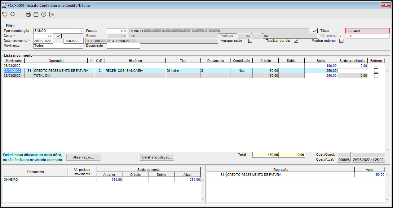 Imagem 09 - Demonstra o componente FCCFL004, onde estão sendo consultadas as informações do extrato de conta corrente referente ao banco "336 - C6 Bank" e pode ser visto que foi realizada a movimentação corretamente no crédito no valor de "R$ 150,00".