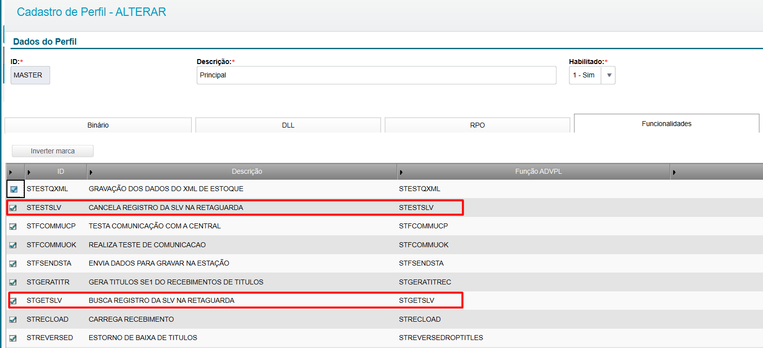 Habilitar no Cadastro de Perfil do MASTER as funcionalidades STESTSLV e STGETSLV.