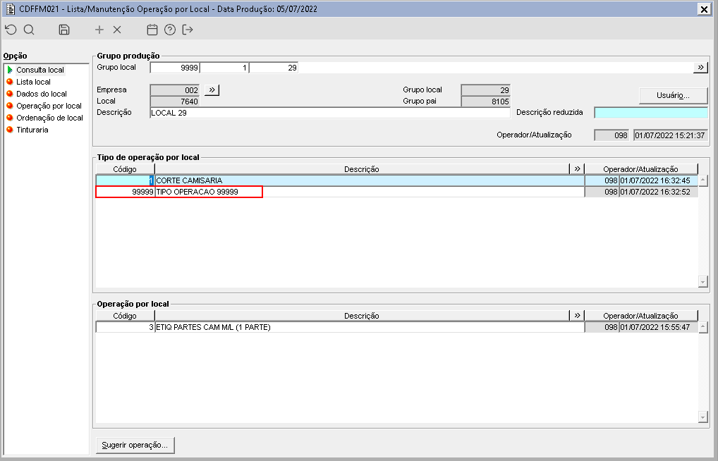 Imagem 4 - O local 7640 possui o tipo de operação 99999 configurado, os tipos/operações da O.P. vão ser validados de acordo com os tipos/operações do local destino.