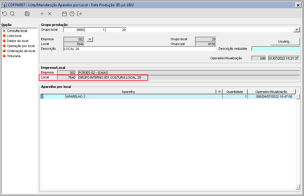 Imagem 3 - O local 7640 também possui aparelho configurado, este aparelho é diferente dos aparelhos configurados nas operações do grupo de produtos da O.P. 91.