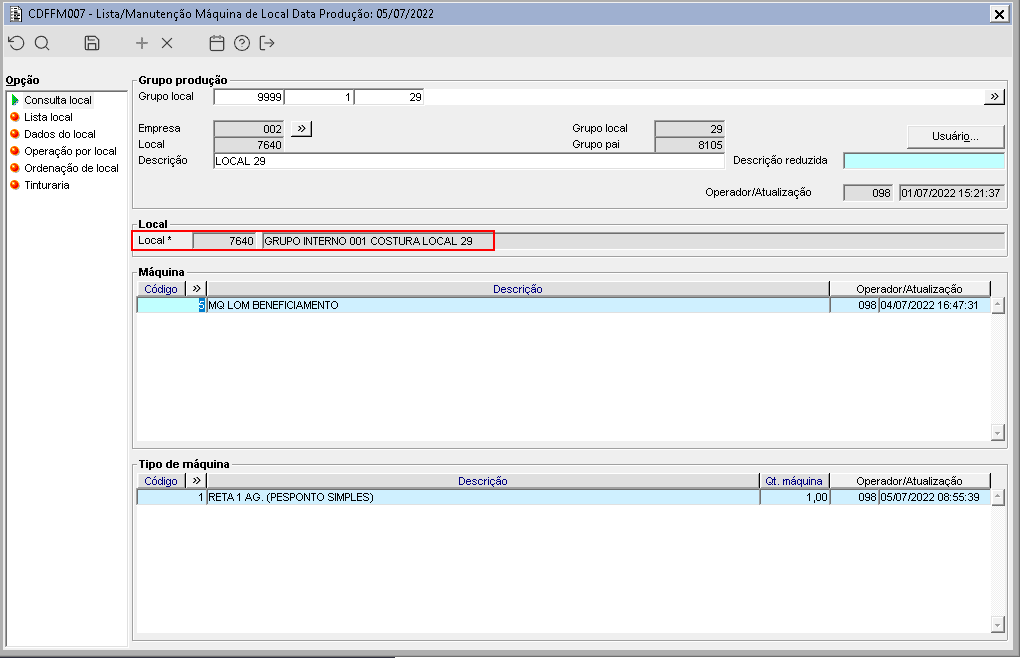 Imagem 2 - O local 7640 possui máquinas e tipo de máquinas configurados, estas são diferentes das máquinas e tipos de máquinas das operações do grupo de produtos da O.P. 91.
