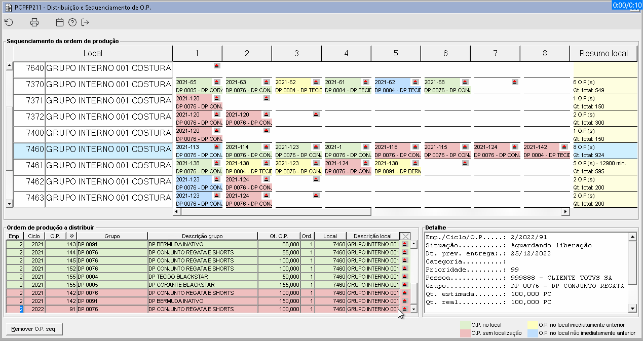Imagem 5 - O grupo de produtos da O.P. 91 possui as operações 1000001, 1000002, 1000003 e estas operações possuem o tipo de máquina 99999 e os aparelhos TP777, TP888 e TP999 configurados. Como esse tipo de máquina e aparelhos não estão configurados para o local 7640, ao sequenciar a O.P. 91 deverá ser exibida uma mensagem informando os itens faltantes no local para produzir a O.P. 91.