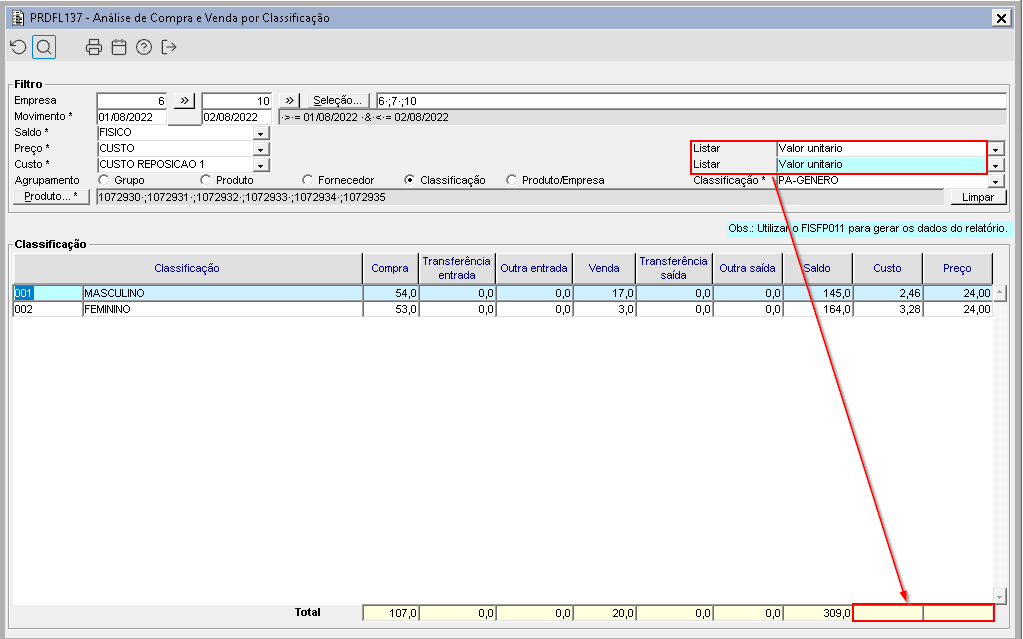 Foi requisitada a possibilidade do usuário quando efetuar análise de Compra e Venda por classificação através do componente PRDFC020 → PRDFL137, possa visualizar os totalizadores de Custo e Preço, quando selecionado no filtro "Listar" a opção "Valor Total (Valor Unitário x Saldo)" corretamente.