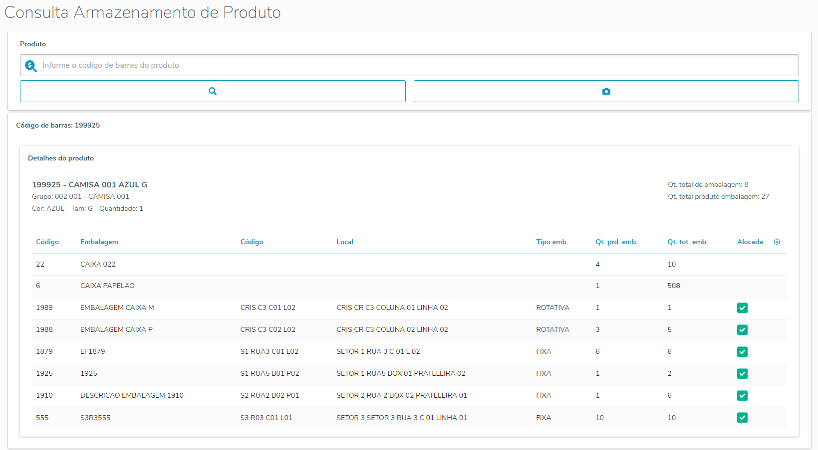 Na Consulta Armazenamento de Produto é necessário exibir as embalagens/locais do produto informado.