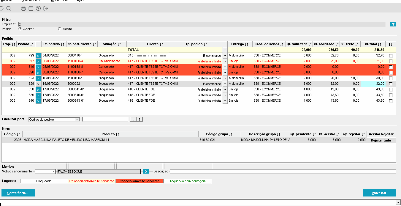No PEDFP144 foi criada uma condição para validar a quantidade de aceite/rejeição apenas de pedidos bloqueados(Aguardando aceite).