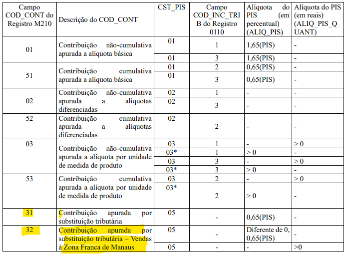 Dessa forma, os débitos decorrentes de operações sujeitas à ST e os débitos da apuração própria do regime não cumulativo devem ser apurados de forma segregada, não havendo previsão legal para compensação cruzada entre: Segue Guia Prático 1.35 trazendo especificações do Registro M210 e seu detalhamento para escrituração: