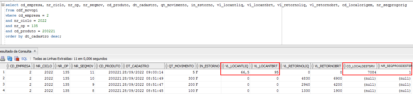 Imagem 6 - Ao realizar uma consulta na entidade CDF_MOVOPI, pode-se observar que para o movimento de acerto de parte foi gravado o CD_LOCALDESTSRV e NR_SEQPROGDESTSRV, essa gravação é necessária para quando existir a necessidade de estornar o movimento de acerto, neste caso os valores e quantidades da parte voltarão para o local origem gravado.