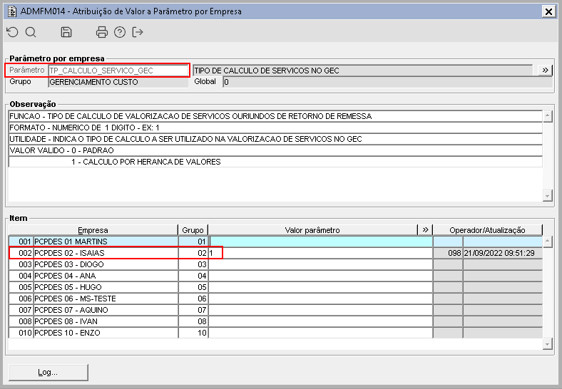 Imagem 1 - O parâmetro TP_CALCULO_SERVICO_GEC foi implementado para validar o tipo de cálculo que deverá ser efetuado ao realizar o acerto de parte. Quando configurado com o valor 1 será chamado o componente PCPFP217 para permitir ao usuário escolher o local que receberá a valorização do serviço.