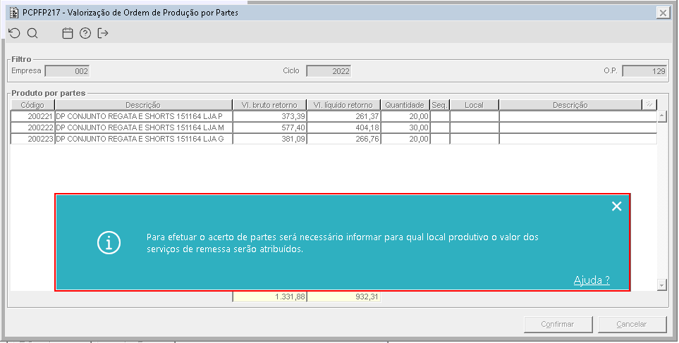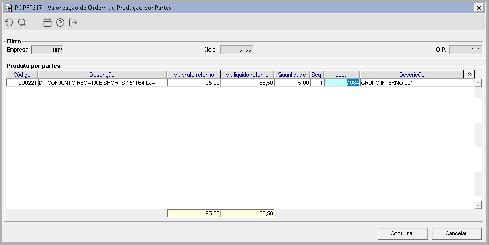Imagem 5 - No exemplo acima, ao realizar o acerto de parte da O.P. 135 os valores de parte foram transferidos para o local 7084.