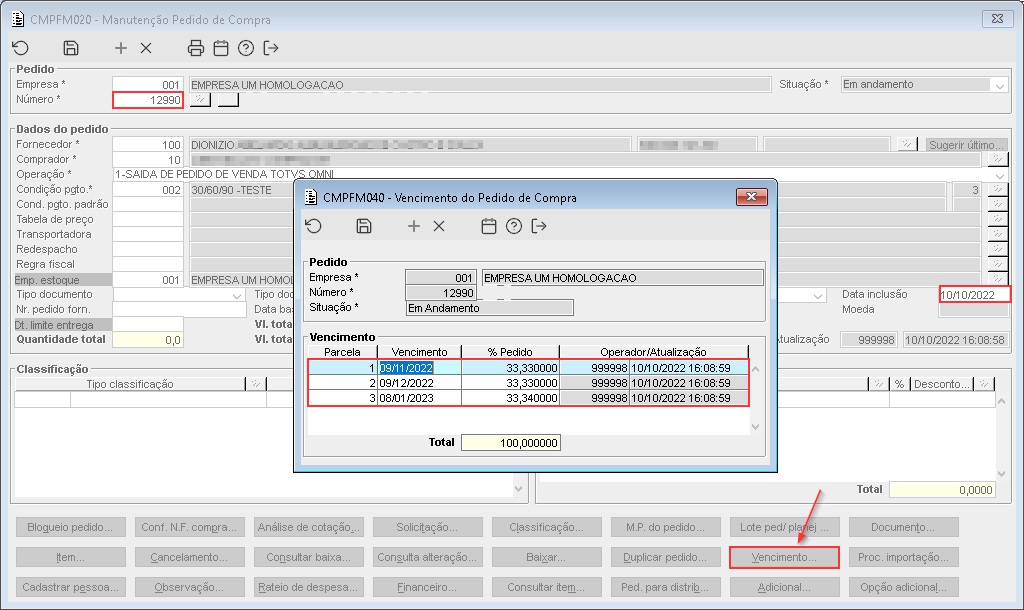 Imagem 04 - Demonstra o componente CMPFM020, onde está sendo criado o pedido de compra "12990", informada a condição de pagamento "002" e a data de inclusão do mesmo é "10/10/2022" ao realizar a gravação, pode ser observado através do componente CMPFM040, que as parcelas foram geradas corretamente respeitando a data e a condição de pagamento informada anteriormente.