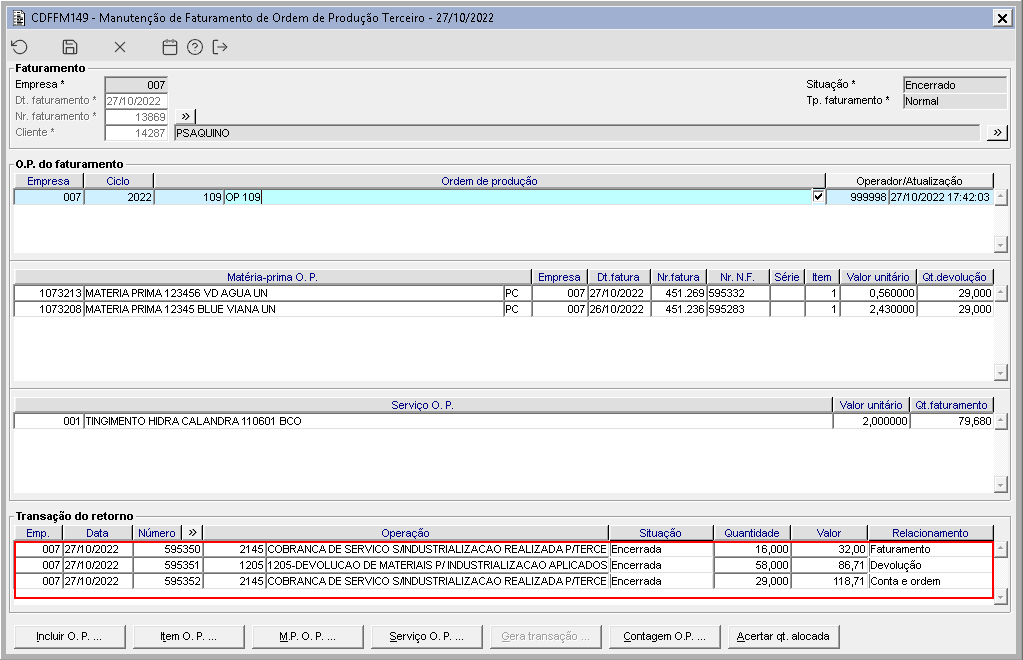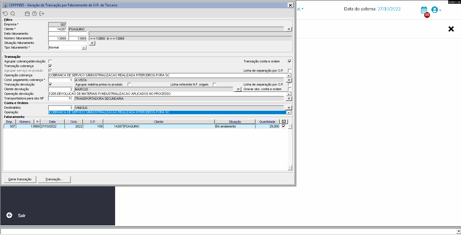Imagem 5 - Na imagem acima, são demonstradas as transações geradas na imagem 4. Foram geradas as transações de faturamento, devolução e conta e ordem.