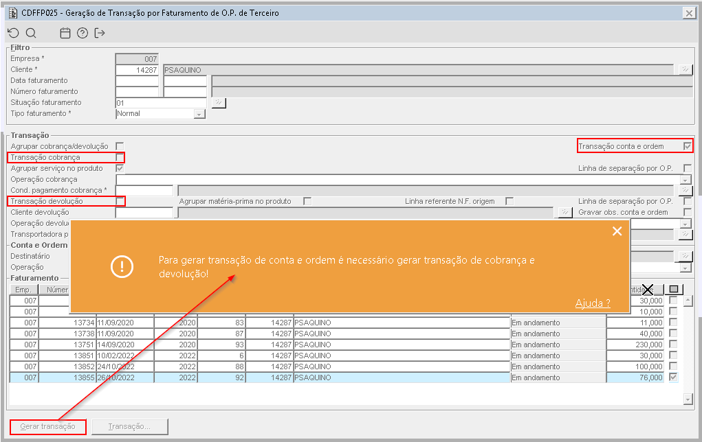Imagem 4 - Para realização da transação conta e ordem. é preciso que realize também a transação cobrança, devolução ou ambas.
