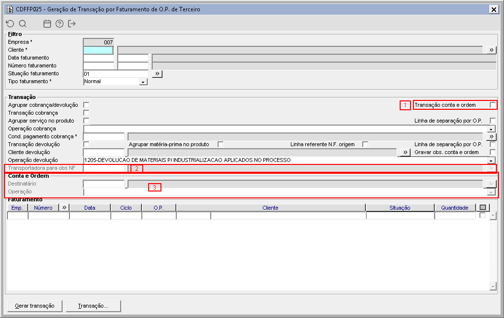 - Transação conta e ordem Esse campo tem por finalidade a geração da transação por conta e ordem;