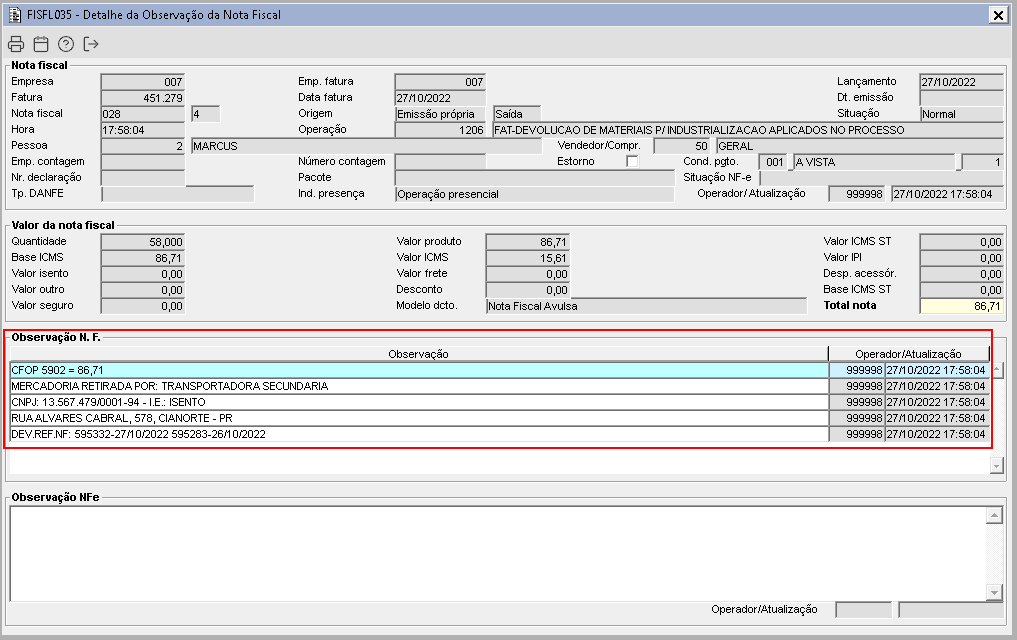 Imagem 8 - Na nota fiscal de devolução, será gravada na observação os dados da transportadora. Para que seja gravada esse dado, é necessário marcar o campo Transportadora para obs NF, mencionado na imagem 1 item 2.