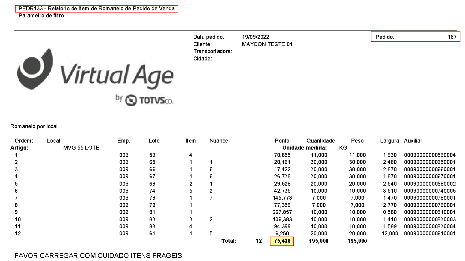 Imagem 2 - Demonstração do "Relatório de Item de Romaneio de Pedido de Venda" (PEDR133), onde destaca-se o novo campo implementado referente a média dos pontos. Esta média será calculada pelo total de pontos (neste caso 905,260) dividido pelo número de registros (neste caso 12), desta forma totalizando 905,260 / 12 = 75,438.
