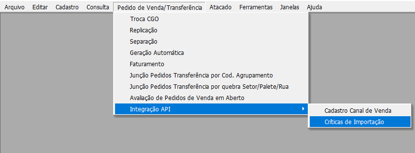 Acesse o Módulo Vendas, clique no menu Pedido Venda/Transferência, submenu Integração API, em seguida clique na aplicação Críticas de Importação.