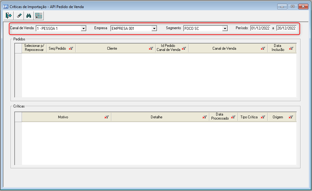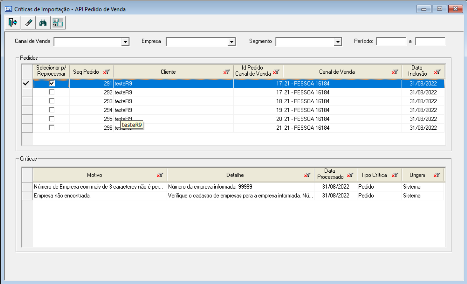 Vendas > Pedido de Venda/Transferência > Integração API> Críticas de Importação.