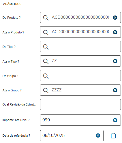 - Qual Revisão da Estrutura ? - Indica qual revisão da estrutura será considerada na emissão do relatório.
