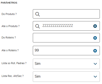 - Lista só Roteiro Padrão ? - Indica se será considerado somente o roteiro padrão na emissão do relatório. (1-Sim e 2-Não)