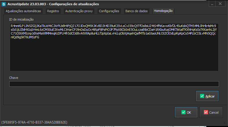 Nas configurações do update foi criado uma nova aba chamada Homologação, nela vai mostrar o ID da inicialização, que precisa ser repassado ao reponsavél da instalação para que consiga gerar a chave de liberação. Após gerar a chave basta informa a mesma no update e clicar em aplicar. Após aplicar basta reiniciar o serviço de servidor de PDV que o mesmo já se encontrará em homologação.